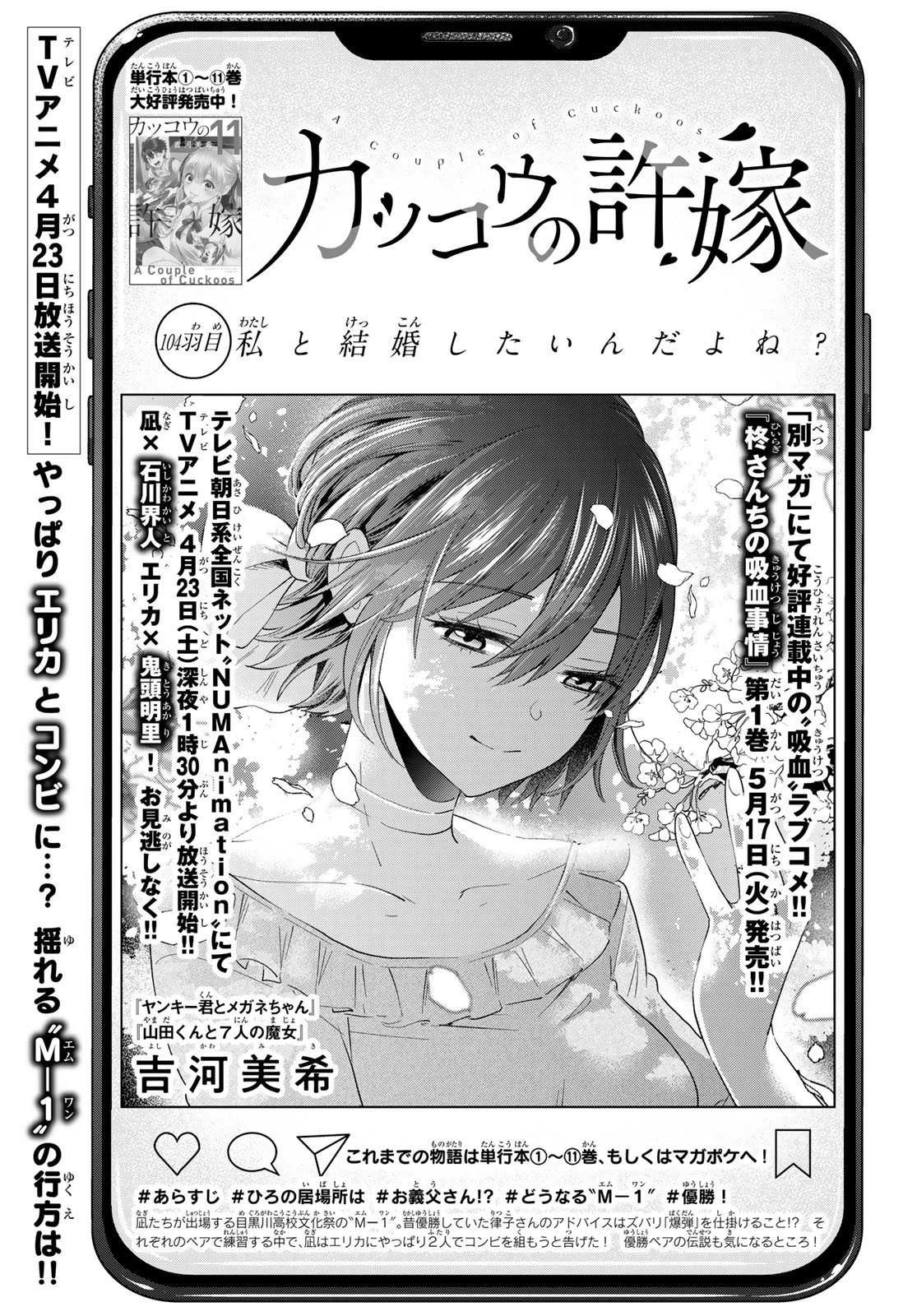 "You Want to Marry Me, Don’t You?" is the one hundred and fourth chapter of The Cuckoo's Fiancee manga series.