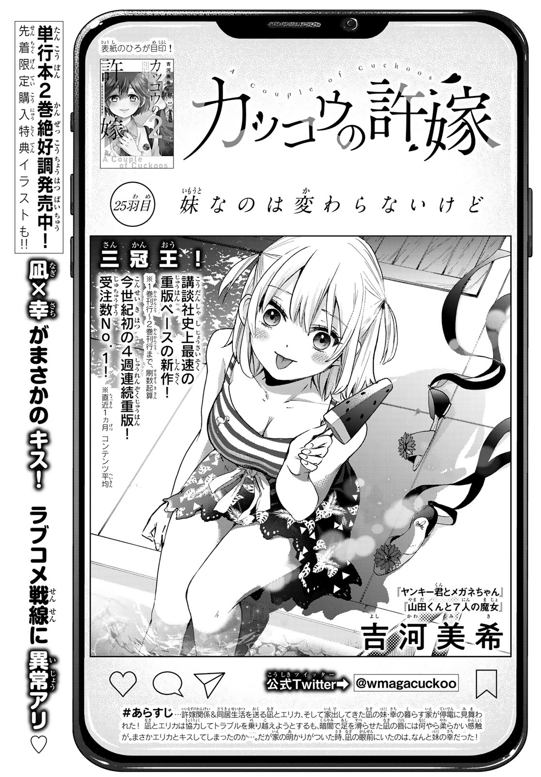 "You’re Still My Little Sister, but…" is the twenty-fifth chapter of The Cuckoo's Fiancee manga series.