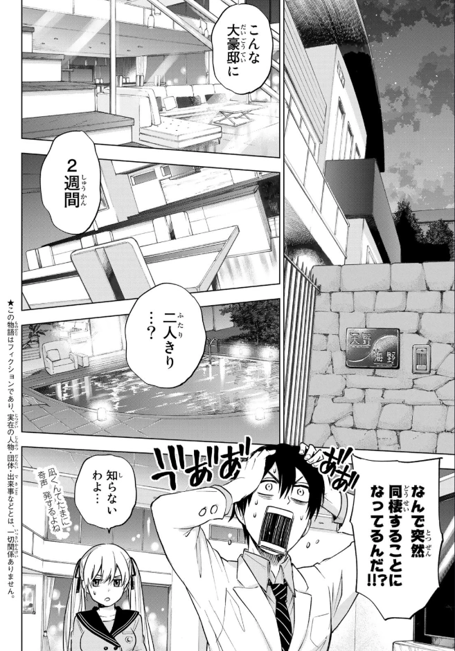 Nagi and Erika are forced to live together in Amano Umino Residence for two weeks but decided to avoid interacting with each other. Nagi plans to use the trial period to prepare for his aptitude test in 2 weeks. However, an incident the next day from both sides initiates their interactions.