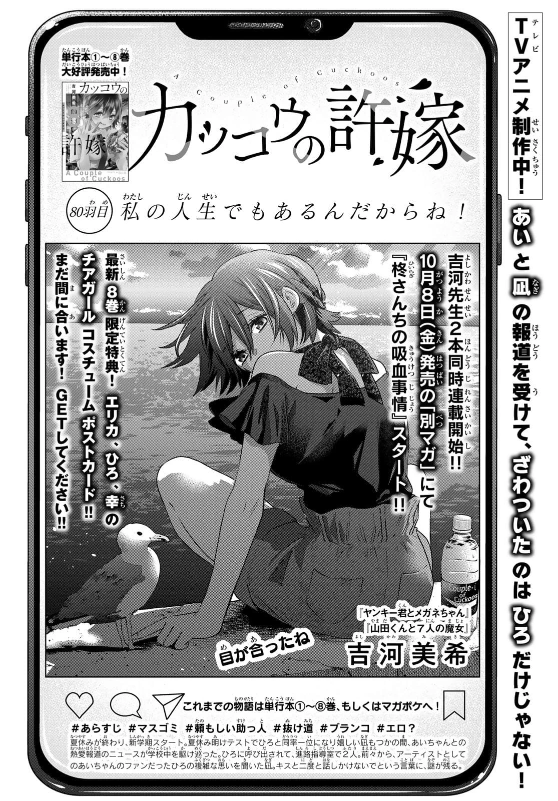 "It's About My Life, Too!" is the eightieth of The Cuckoo's Fiancee manga series.